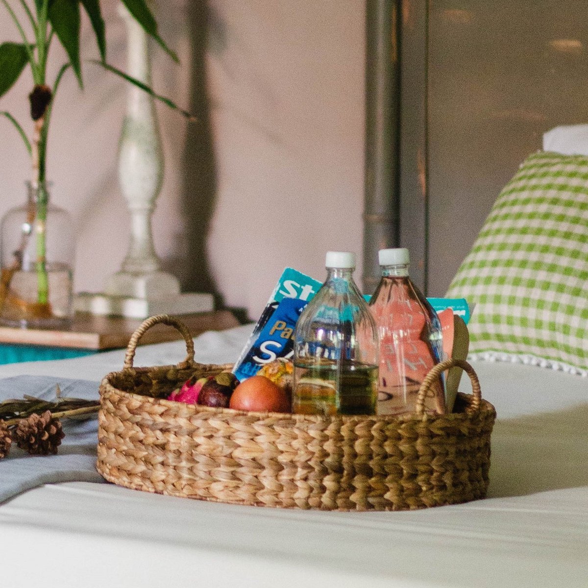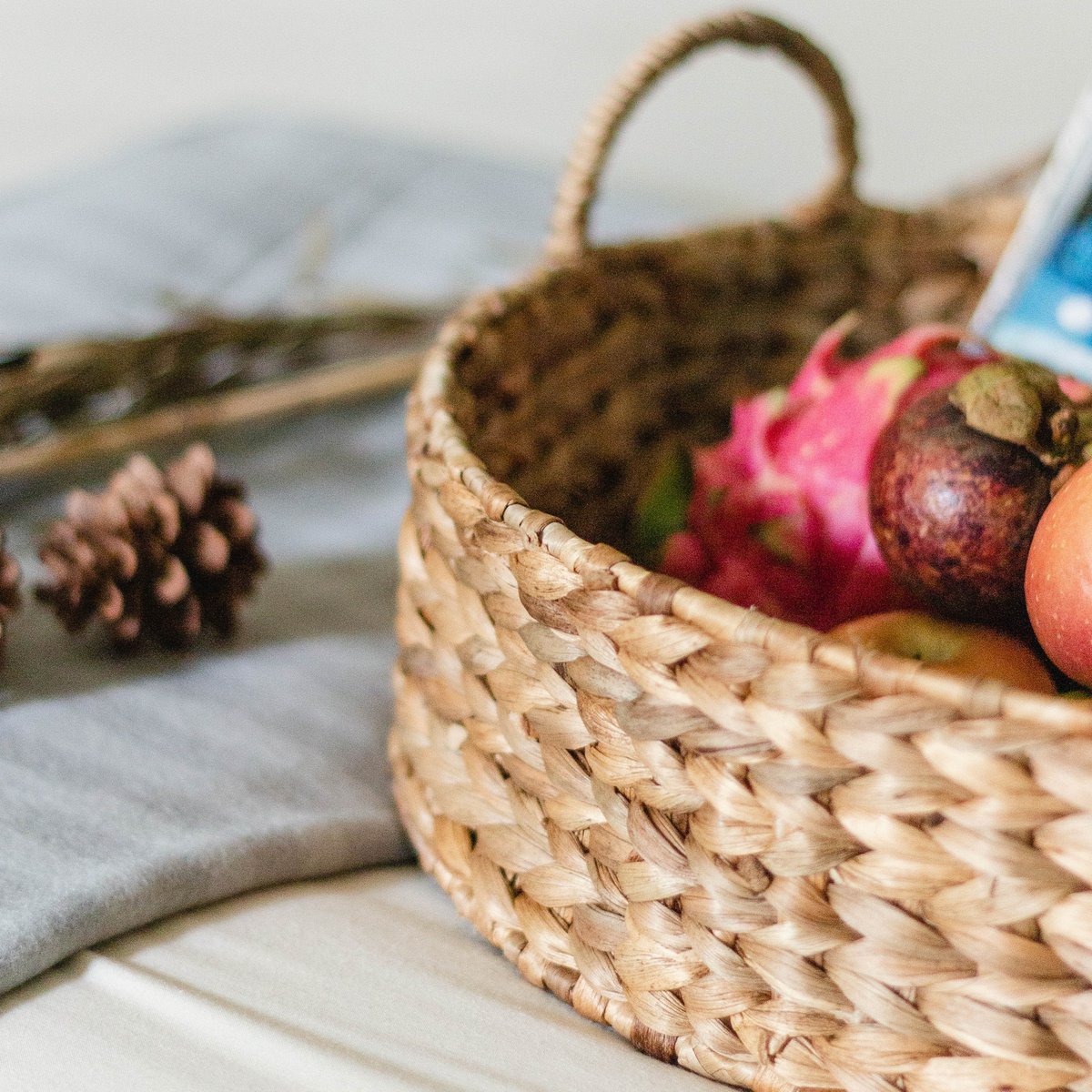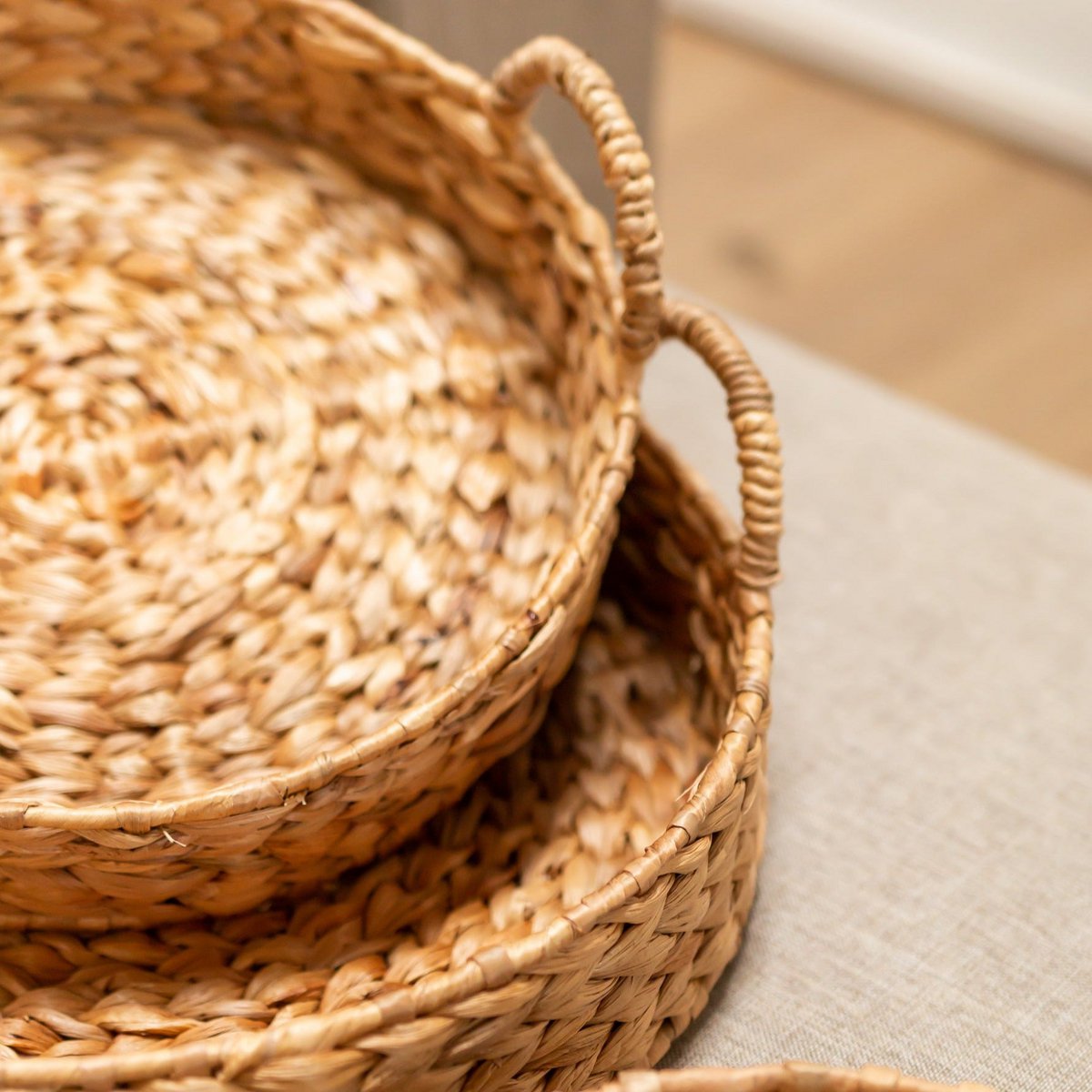 Matahari ist ein praktisches, rundes Tablett aus geflochtener Wasserhyazinthe. Dank des unsichtbaren Metallrahmens bleibt es immer in Form. In seiner größten Größe ist er sogar groß genug, um mehrere Mahlzeiten gleichzeitig zu transportieren.