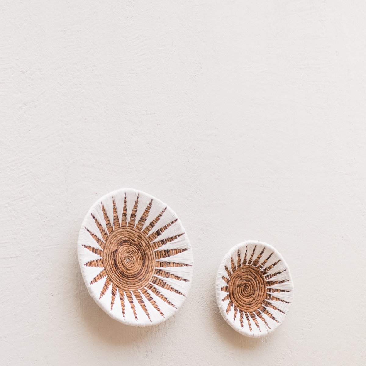 Ein echtes Highlight für natürliches Wohnen im Boho-Stil ist unsere runde Wanddekoration Madala aus gewebter Bananenfaser und einer weißen Stickerei in Sonnenoptik.