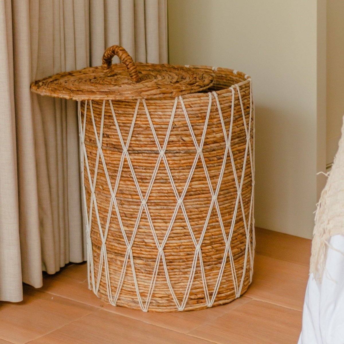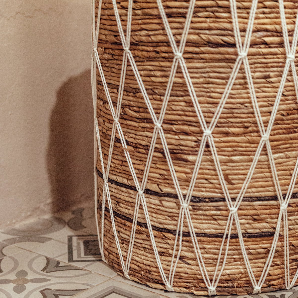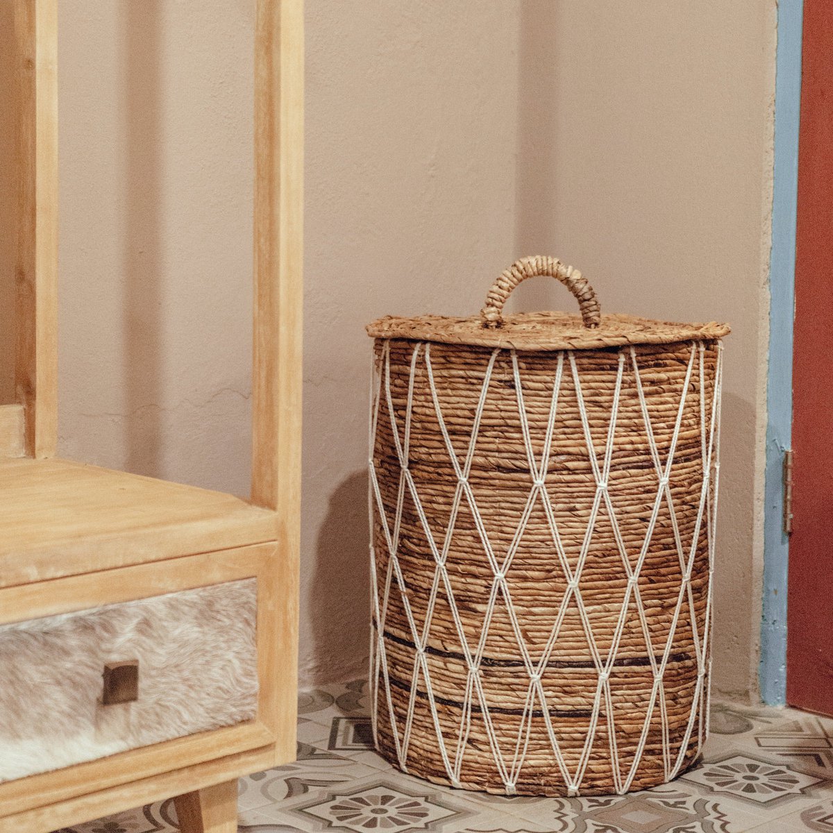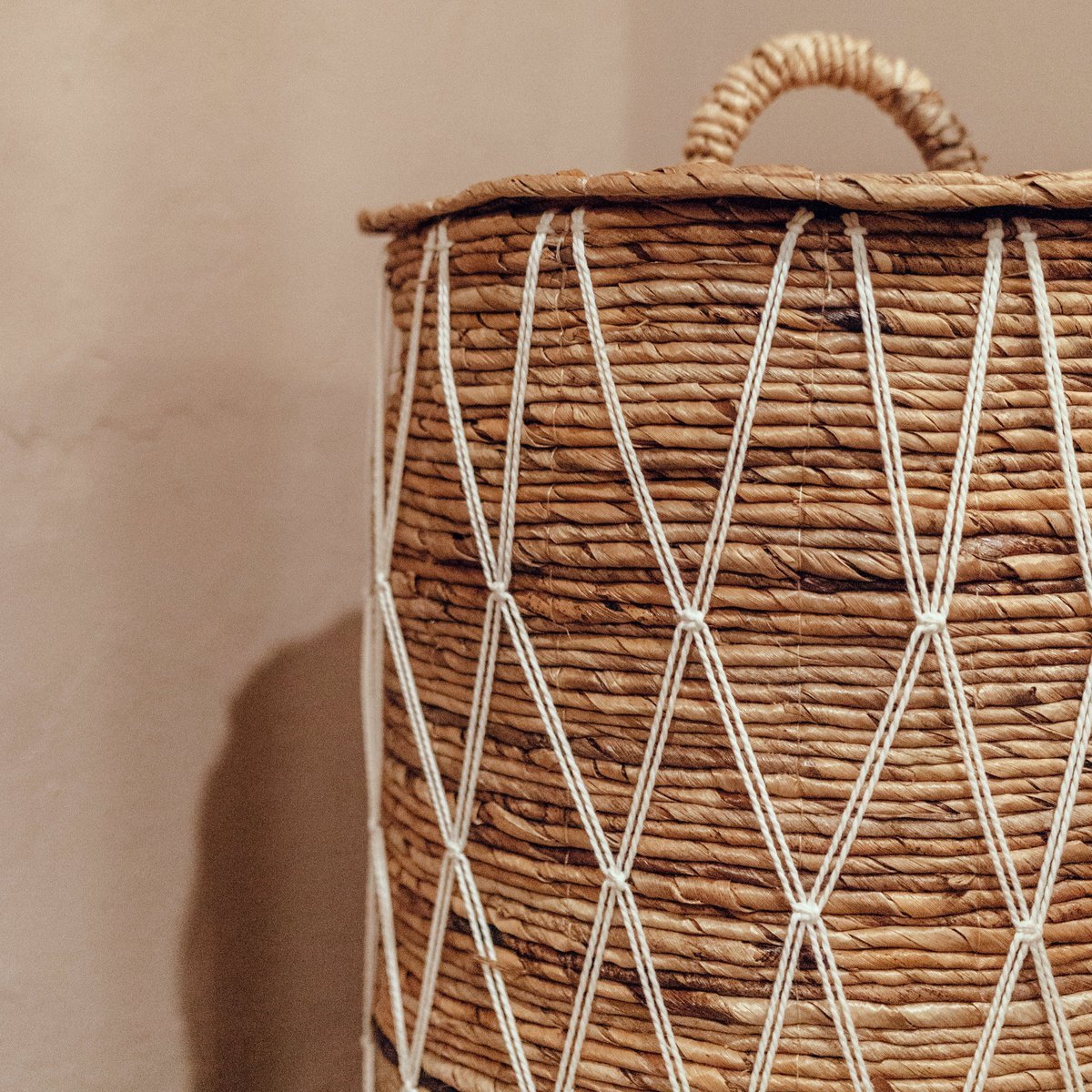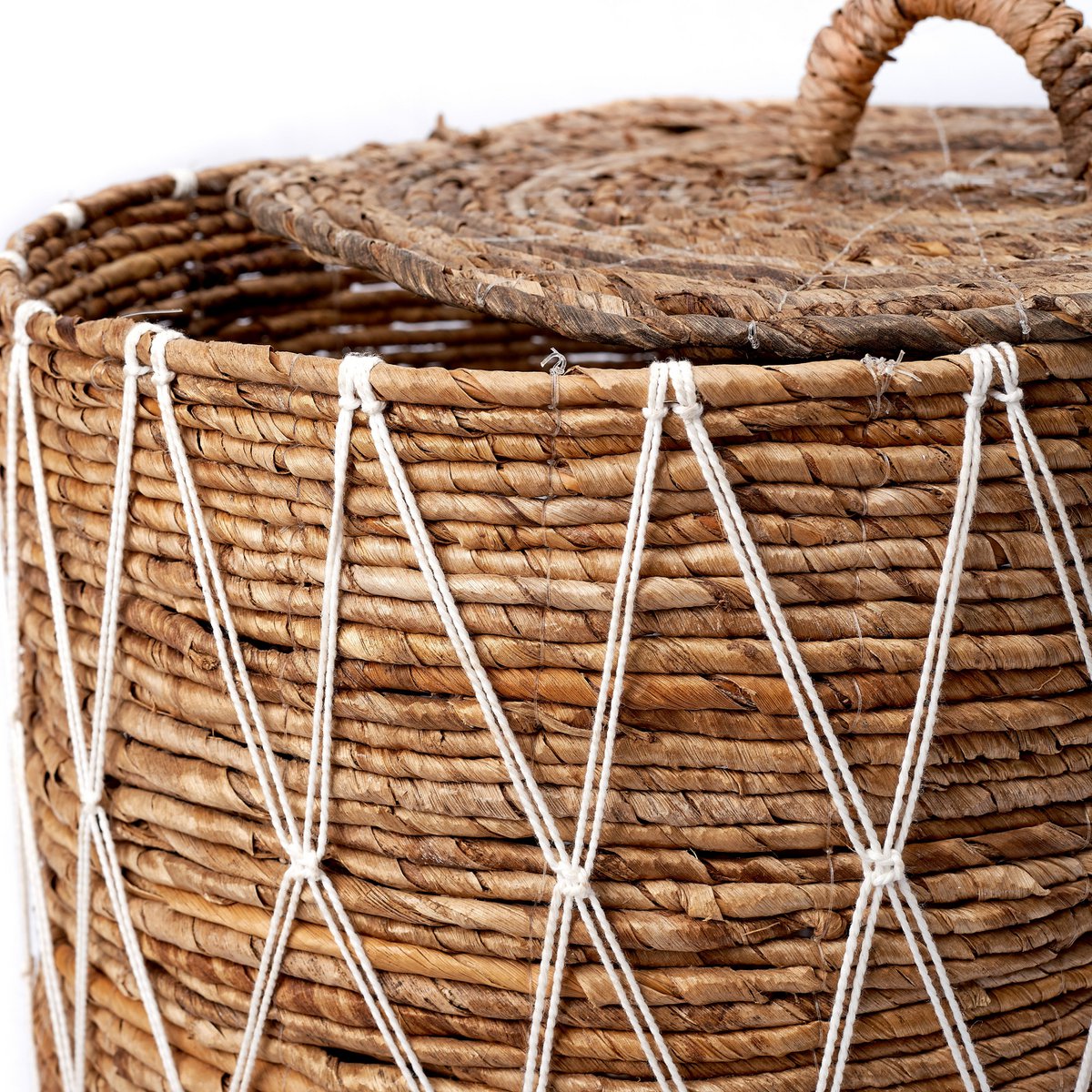 Der passende Deckel verfügt über einen praktischen Griff, der Ihnen das Öffnen des schönen Korbs erleichtert, der mit einem Rautenmuster aus Baumwollkordeln verziert ist. Wenn Sie ihn nicht nur zum Wäschesammeln nutzen möchten, bietet er natürlich auch Platz für viele andere Dinge!