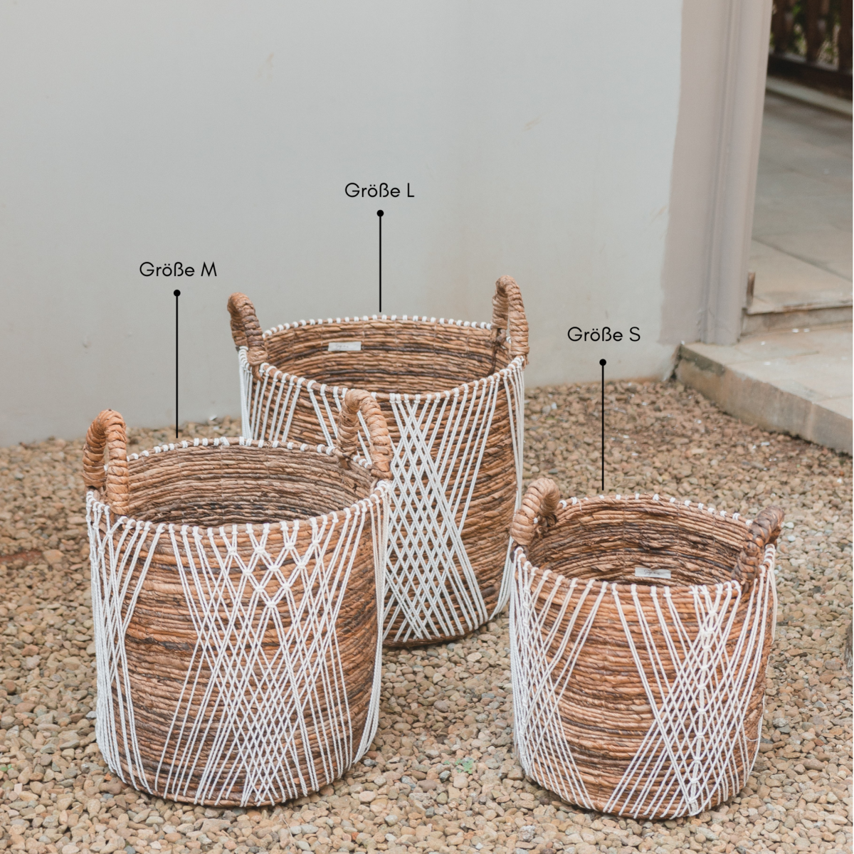 Juwana ist Teil unserer großen Körbekollektion mit der Materialkombination aus Bananenfaser und weißen Baumwollschnüren. Wir können nicht genug davon bekommen – und Sie wahrscheinlich auch. Der tolle Kontrast macht diese Körbe zu echten Hinguckern und macht sie zum mühelosen Highlight eines Raumes.